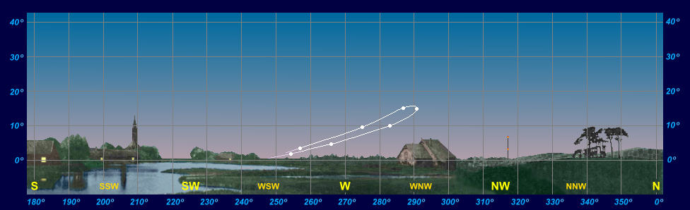 Direction & Altitude (30 minutes after local sunset) and Visibility Duration of Venus for Northern hemisphere latitudes and the Equator for the evening apparition of 2010 (click on thumbnail for full-size table, 107 KB; for Southern hemisphere latitudes and the Equator, click here, 101 KB). To find your latitude, visit the Heavens Above website, select your country and enter the name of your nearest town or city using the 'Town Search' facility.