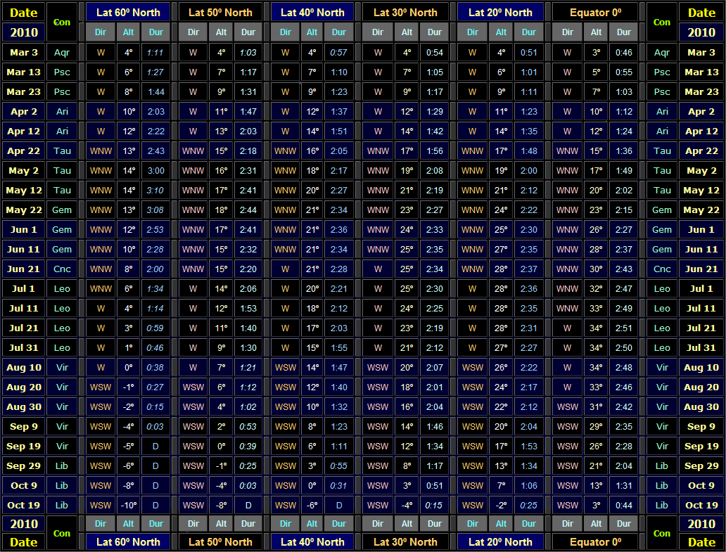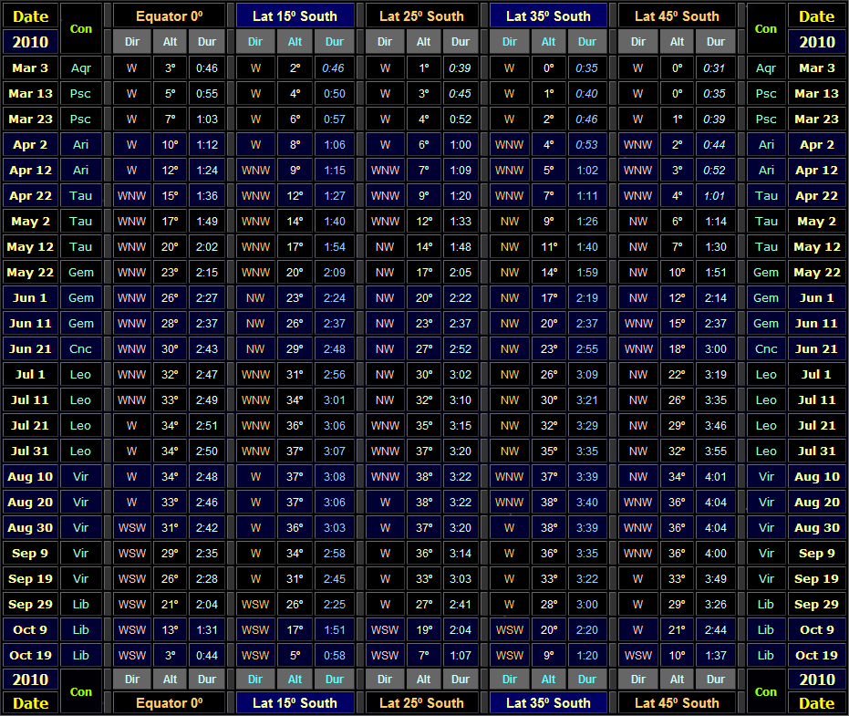 The following tables give the direction and altitude (angle above the horizon) of Venus at 30 minutes after sunset, together with the visibility duration of the planet after sunset, for the 2010 evening apparition. An explanation of abbreviations in the tables is given in the box below. For the sake of convenience, the table is split into Northern and Southern hemisphere latitudes (the Equator is included in both tables to allow interpolation of the data for observers situated at Equatorial latitudes). These tables should have proved sufficient to locate the planet in twilight, allowing telescope users to view the planet in comfort (because of Venus' brilliance, glare becomes a problem when the planet is seen through the eyepiece against a dark sky). Direction and Altitude diagrams are also provided below for intermediate latitudes of 55° North, 35° North, 30° South and the Equator.