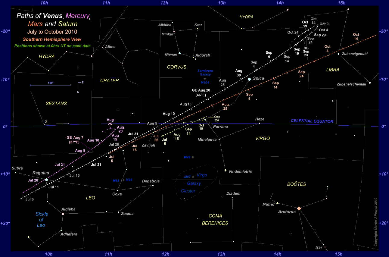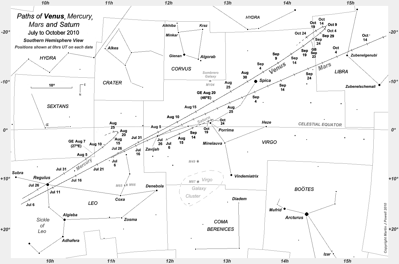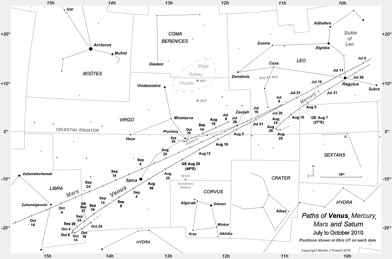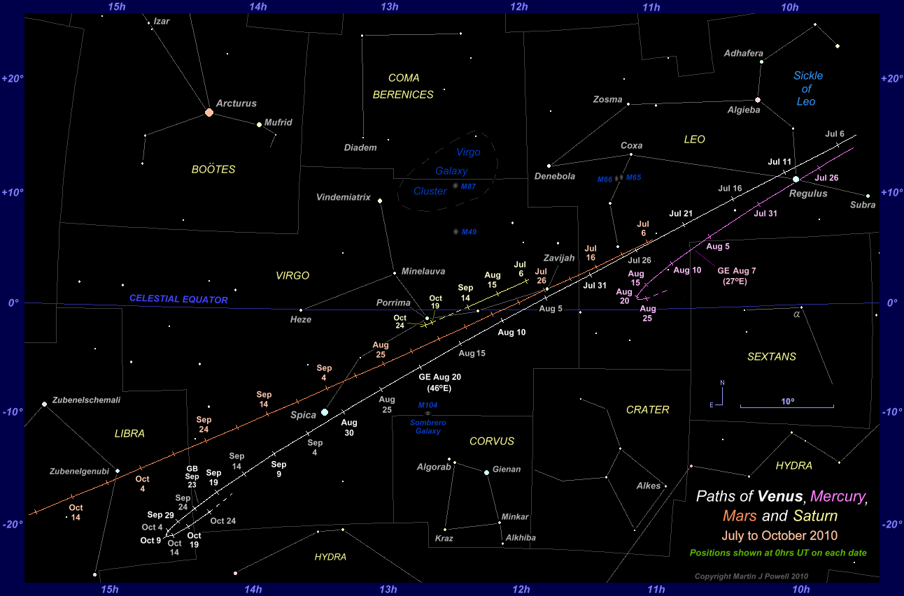 Planetary conjunctions of Venus with Mars took place on August 23rd and September 29th; a conjunction of Venus with Saturn took place on August 10th (for more details see the Venus planetary conjunctions table). The path of Mars on this chart is continued from the Mars 2009-10 chart, whilst that of Saturn is excerpted from the Saturn 2006-13 chart; more details of these planets' apparitions can be found on these pages.
