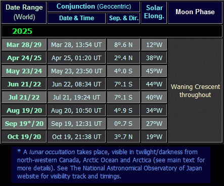 Venus conjunctions with other planets during the 2025 morning apparition (click on the thumbnail for the full-size table) The column headed 'UT' is the Universal Time (equivalent to GMT) of the conjunction (in hrs : mins). The separation (column 'Sep') is the angular distance between the two planets, measured relative to Venus, e.g. on 2025 April 29, Saturn is positioned 3°.7 South of Venus at the time shown. The 'Fav. Hem' column shows the Hemisphere in which the conjunction is best observed. Observers situated at latitudes close to those shown in the 'Notes' column will most likely find the conjunction difficult or impossible to observe because of low altitude and/or bright twilight.