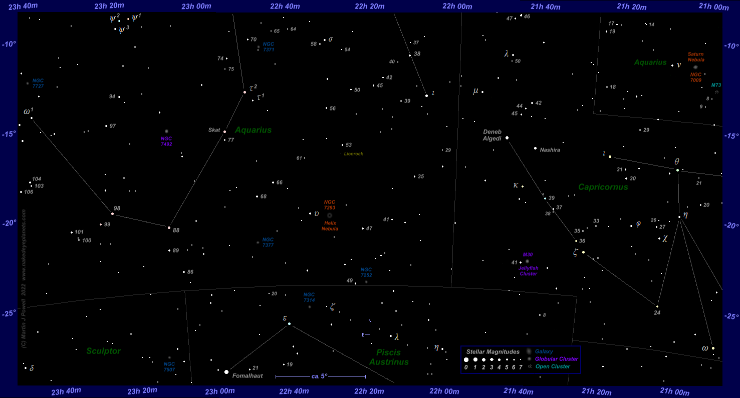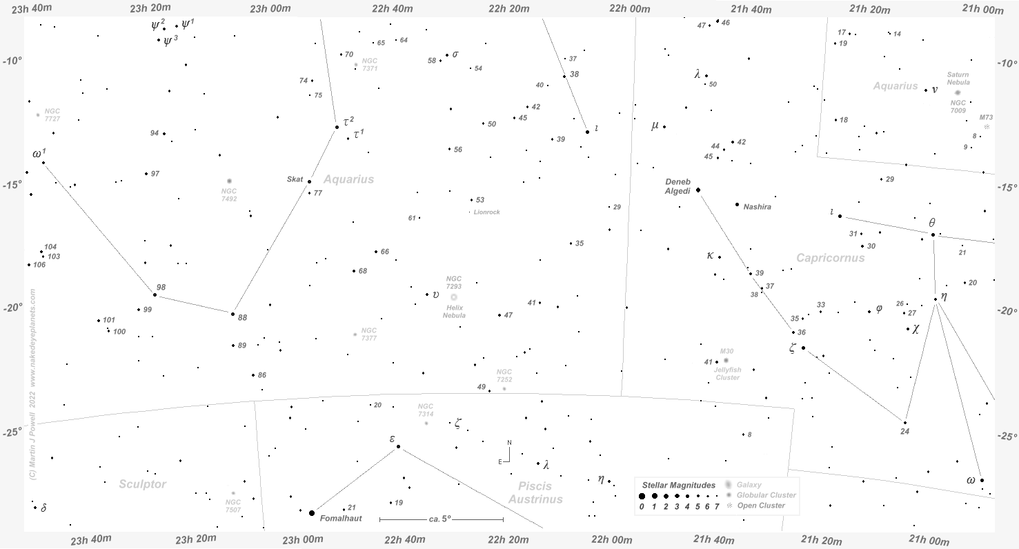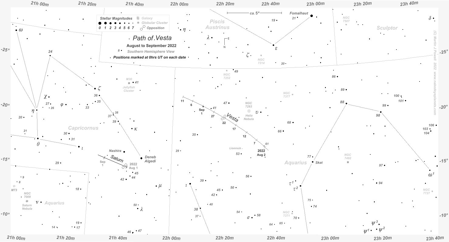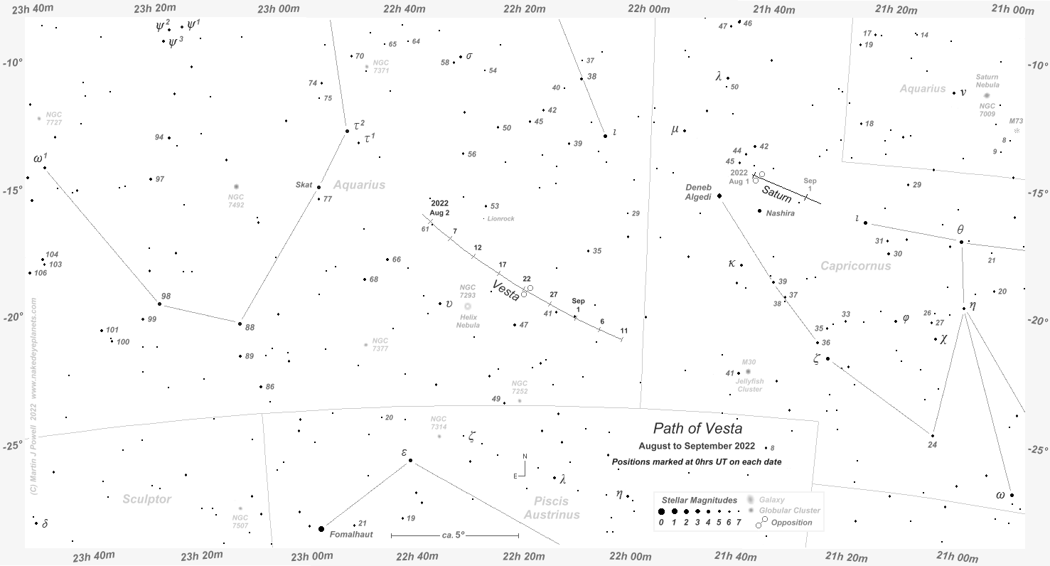 Finder Chart showing the path of asteroid 4 Vesta through southern Aquarius at 5-day intervals from late July to mid-September 2022 (click on the thumbnail for the full-size chart, 134 KB). This is the period during which the asteroid was technically visible to the naked-eye (i.e. brighter than apparent magnitude +6.5) from fully dark, non light-polluted skies. A Southern hemisphere view of the chart can be found here (137 KB) and a printer-friendly (greyscale) version can be obtained for Northern (59 KB) and Southern hemisphere (60 KB) views. The path of Saturn, positioned close by in Capricornus, is also shown over the same period.